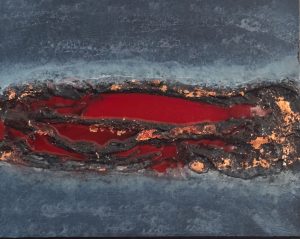 Mixed media on wooden art board, finished in epoxy resin. The red seam running through the blue-grey surface with copper leaf at the edges – it looks like something the earth split open to reveal. Which is more or less what happened when the paint hit the board.