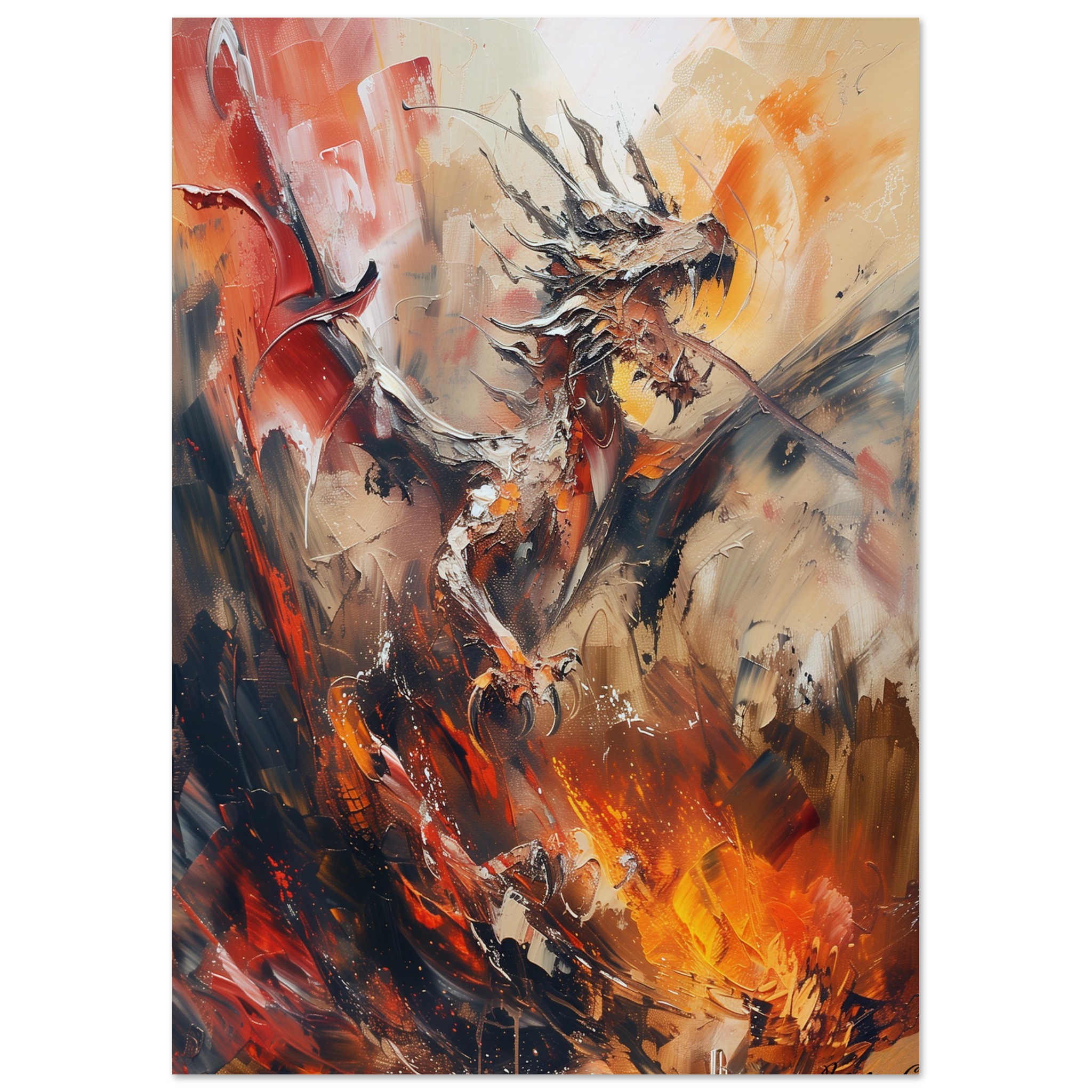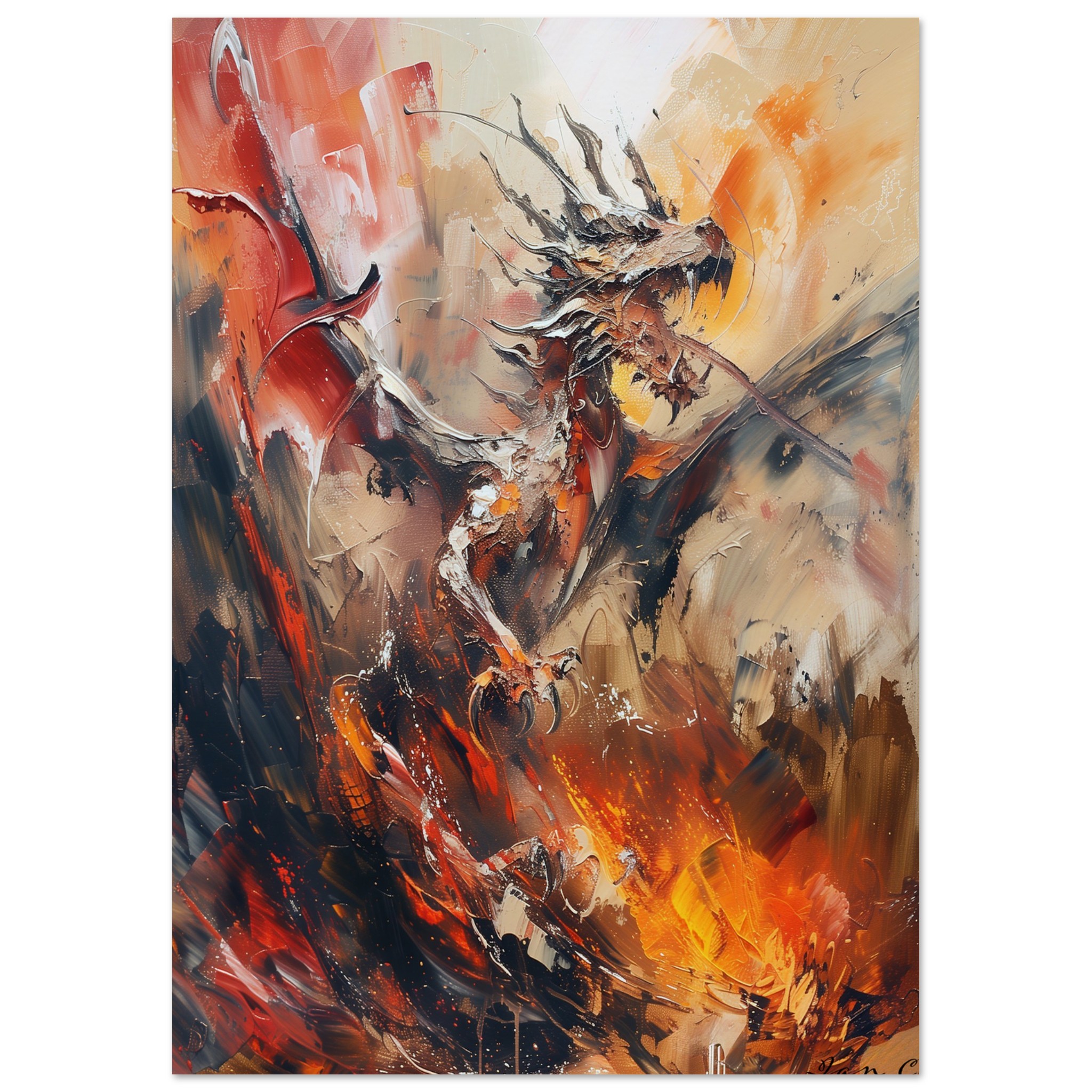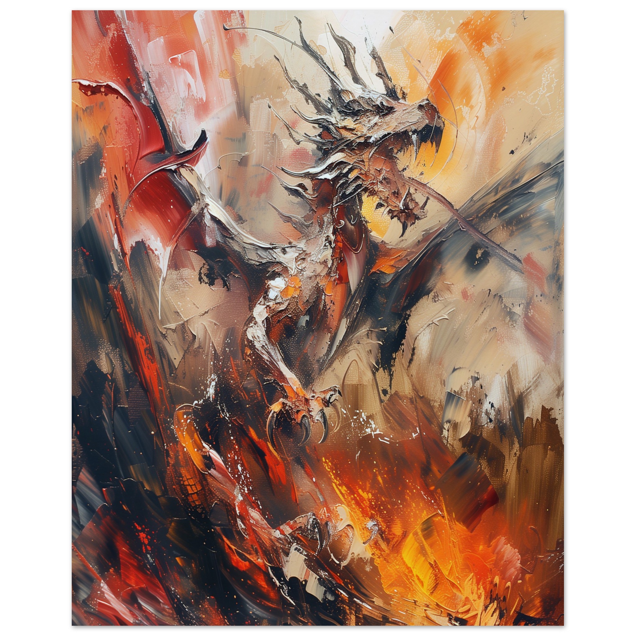 This piece captures the ferocity and grace of a dragon mid-flight, enveloped in a whirlwind of fiery hues and dynamic brushstrokes. It’s more than a print; it’s a conversation starter, a statement piece, and a window into a world of fantasy.